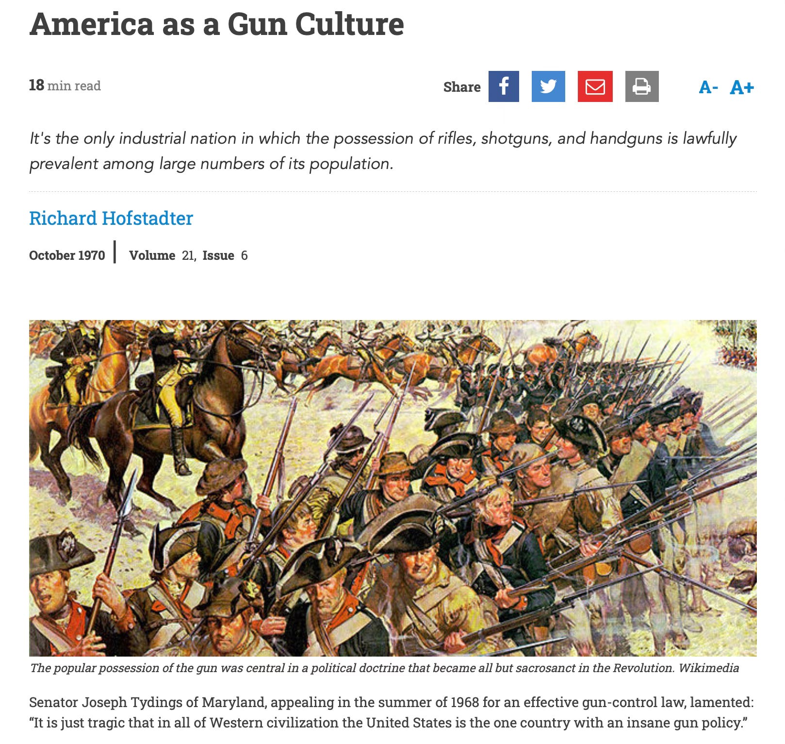 坐着“五月花号”来到北美大陆后,为了反抗暴政、阻止欧洲人与印第安人的入侵、镇压叛乱以及自卫,枪更是成为早期殖民地人安身立命的必备之物。在早期一些州的宪法中,如1776年宾夕法尼亚州宪法便明确规定“人民有权力拥有武器以保护他们自己和本州。” 而像弗吉尼亚州、马萨诸塞州和纽约州的政府甚至用法律的形式强制要求民众拥有和携带武器。这些配枪的男人,便形成美国的民兵传统,成为建立美国最重要的武装力量。如1769年的波士顿《时代杂志》(A Journal of the Times),就呼吁波士顿公民拿起武器武装,反抗英国政府的滥用权力:“拥有武器以保护他们自己,以及如布莱克斯通爵士(即Sir William Blackstone,英国十八世纪法官、政治家,《英国法律释义》Commentaries on the Laws of England的作者。笔者注)所指出的,当社会和法律的制裁不足以约束压迫和暴力时便可以使用,是每一个人都拥有的一项天赋人权(a natural right),这是(英国)《权利法案》所确认的。”(It is a natural right which the people have reserved to themselves, confirmed by the [English] Bill of Rights, to keep arms for their own defense, and as Mr. Blackstone observes, it is to be made use of when the sanctions of society and law are found insufficient to restrain the violence of oppression.)实际上,几年后,1775年4月在莱克星顿小镇打响独立战争第一枪的也正是一些一分钟速成的,因此被称为“Minute Men”的民兵队伍;跟随华盛顿将军打了八年独立战争的队伍也一直是一支民兵队伍。因此,枪在美国人民心中有着特殊的地位。