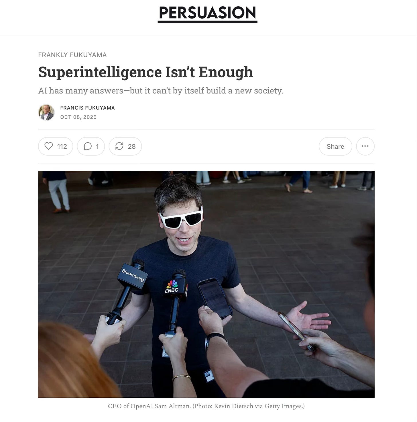 本文原文為英文Superintelligence Isn’t Enough:AI has many answers—but it can’t by itself build a new society(Oct 08,2025),原發来自Persuasion:Francis Fukuyama專欄。作者和雜誌授權,波士頓書評翻譯成中文,為《波士顿书评》福山專欄最新文章。