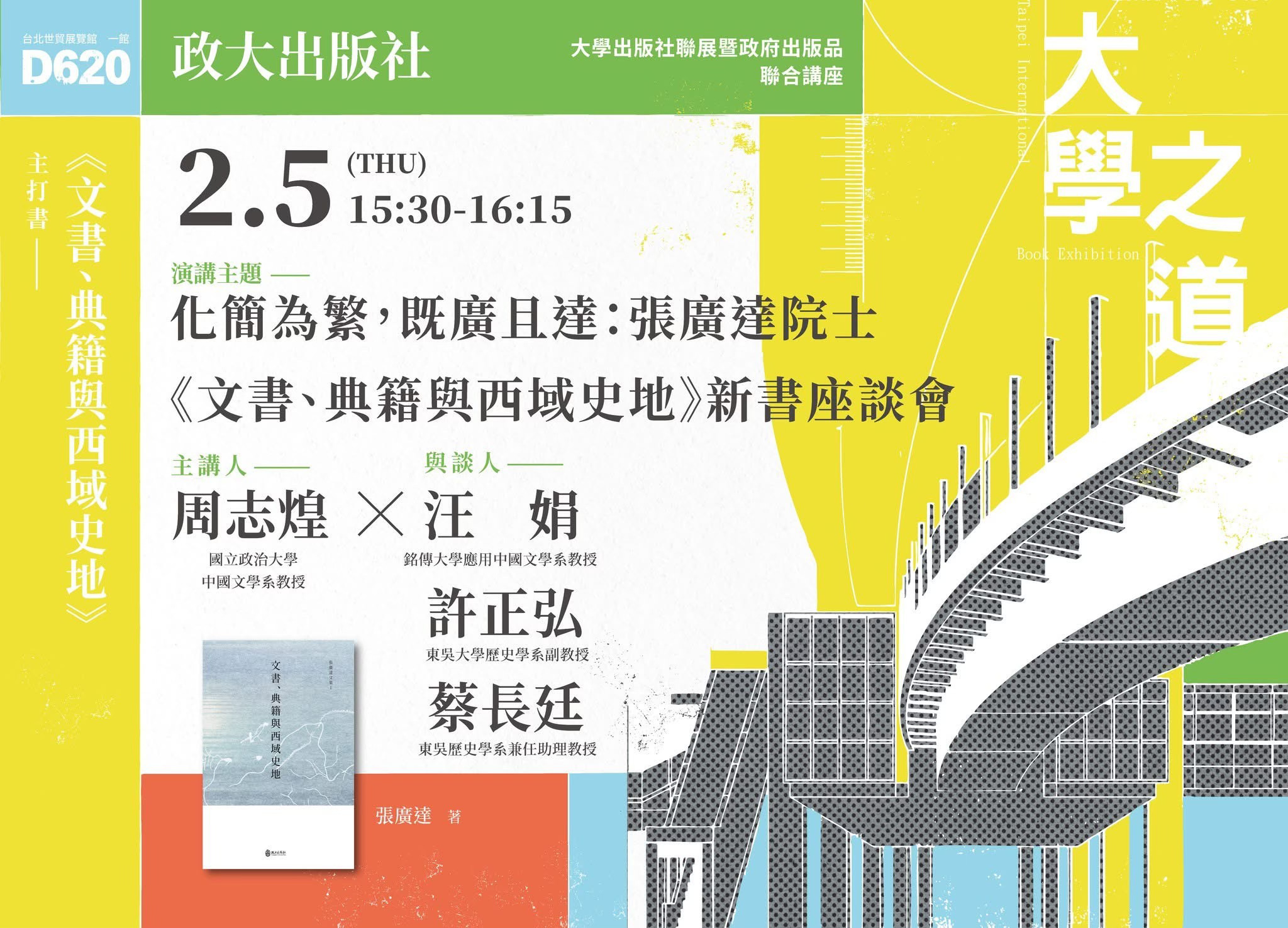 大學出版社聯展「大學之道」: 以學術公共性為核心,由政大、中央研究院、國史館等11所機構聯合策展,規劃逾50場講座,讓高專業性研究成果走進公眾視野。政大出版社攜手舉辦8場新書講座,涵蓋院士鄭毓瑜《姿與言:詩國革命新論》與張廣達《張廣達文集》增訂再版,探討詩學革命、中國史學視野;張晉芬《沒有公婆的一代》剖析世代變遷與家庭結構;另有臺灣文學與文化叢書系列講座,如張文菁從通俗小說檢視1950年代反共與言情文學定位,垂水千惠探討臺日文學的多聲交響與殖民想像。這些講座不僅保存學術遺產,更建構公共論述空間,回應民主、法治與社會變遷議題。
