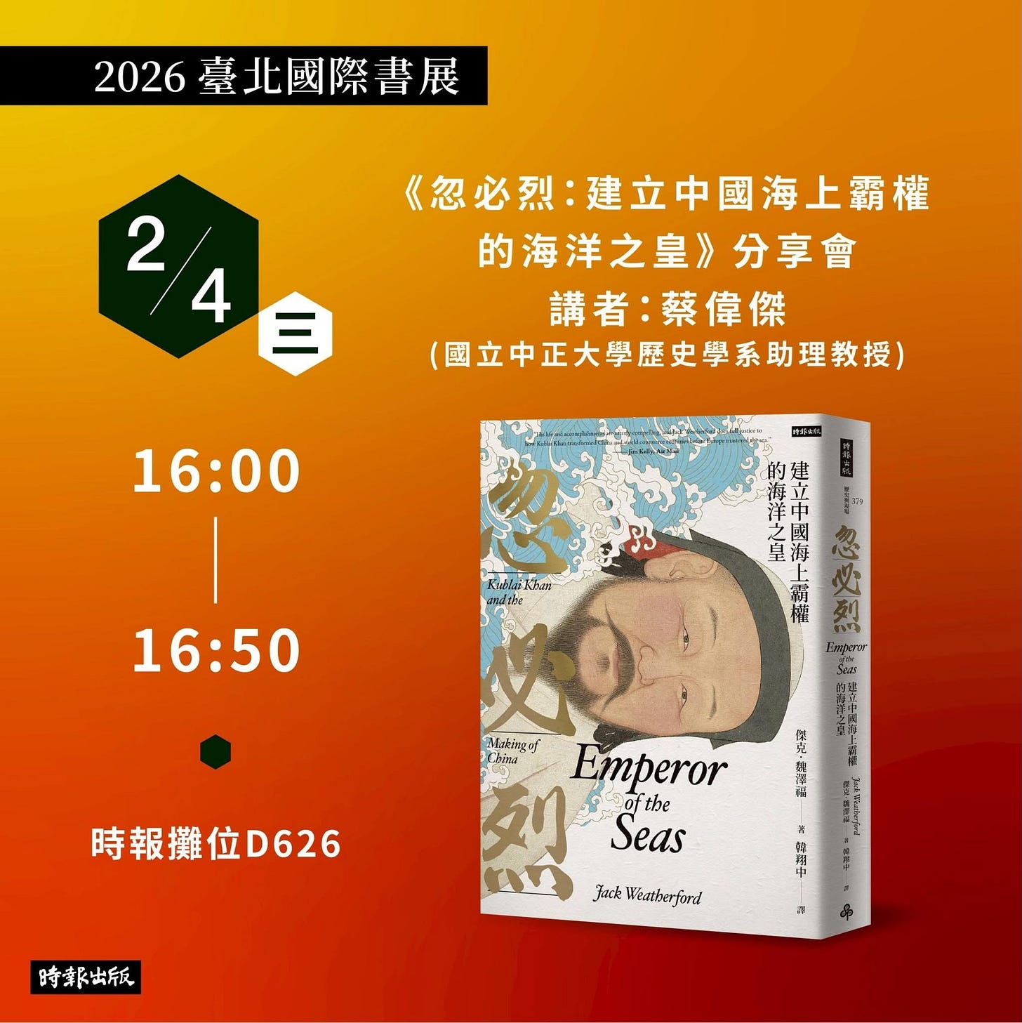 時報出版(攤位D626)以思潮線與吉本線為主軸,舉辦多場重量級講座。例如,吉本芭娜娜半自傳小說《我與城市》與《吹上奇譚》系列新書分享會(2/4 16:45-17:45,主題廣場),邀請吉本芭娜娜親自分享城市與個人記憶的交織,探討現代都市中的孤獨與連結;另有台泰青春小說對談《四月與陽光告別》新書分享會(2/6),邀請台灣作家游善鈞與泰國作家對談,比較兩地青春文學的創作歷程與文化差異,延伸至跨文化情感與成長議題。傑克.魏澤福的《忽必烈:建立中國海上霸權的海洋之皇》 新書分享會,由蔡偉傑教授分享,從海洋視角解讀元代帝國轉型與地緣政治,探討中國古代海上擴張史。此外,時報還參與安東尼‧馬拉歷史小說世界講座(2/某日18:00-19:00,主題廣場),與譯者施清真對談,從車臣到好萊塢,剖析歷史小說的敘事建構與人文深度。