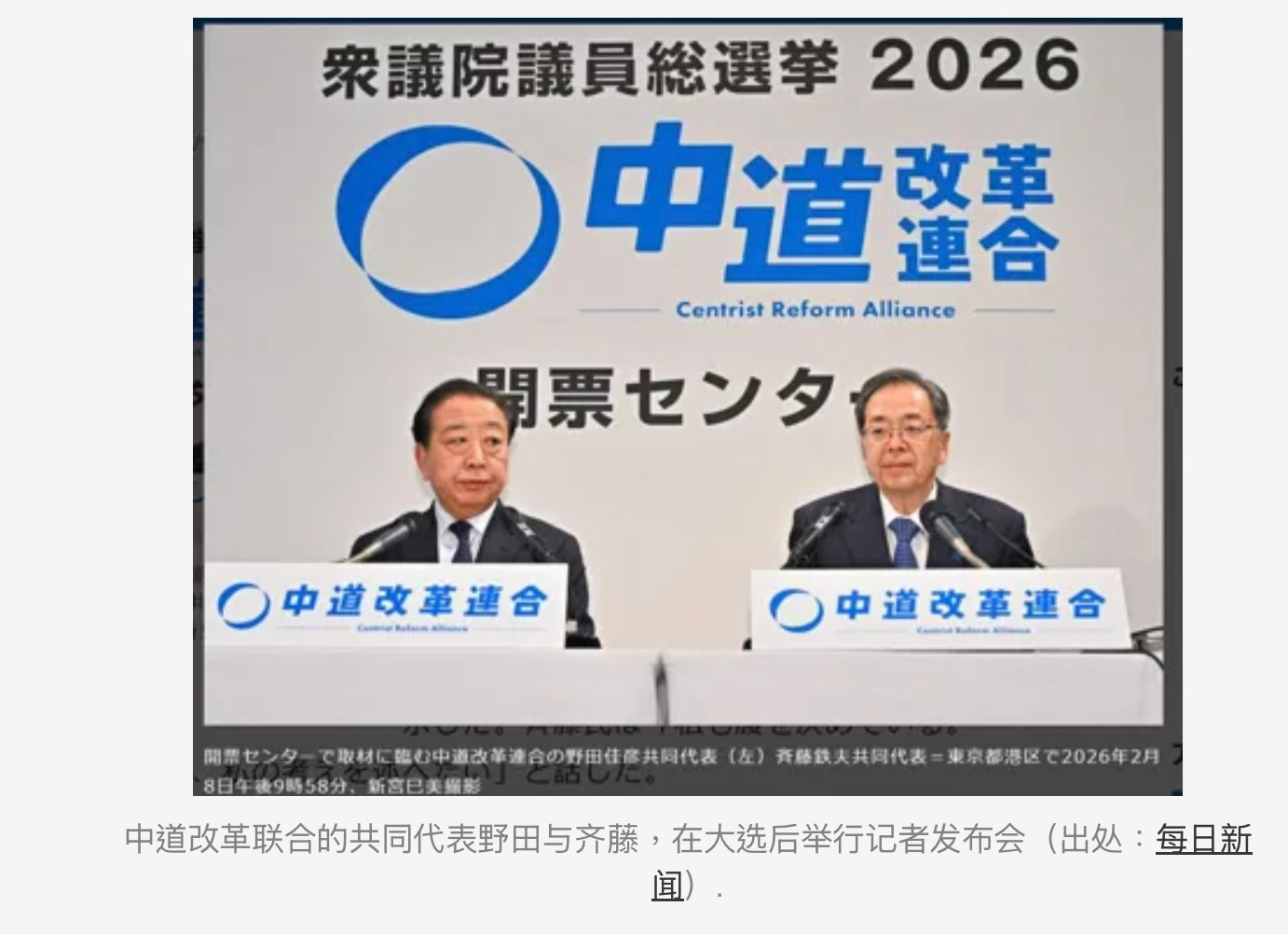 在这样的背景下,立宪民主党与公明党宣布组建新党可谓晴天霹雳。对于试图在野党尚未充分完成选举准备之际实施解散的高市自民党而言,两党能在如此短时间内完成新党组建,显然出乎预料。从1月9日《读卖新闻》报道政府考虑解散众议院,到14日晚《朝日新闻》披露立宪—公明新党成立的消息,仅隔五天;16日,新党正式定名为“中道改革联合”,立宪民主党的党魁·野田佳彦和公明党的党魁·齐藤铁夫共同担任“中道改革联合”的党首。