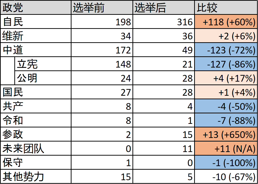 此外,由于自民党在比例代表选举中获得的选票数量过多,而候选人数不足,最终不得不将14个议席让渡给其他政党。也就是说,自民党在理论上本应获得的议席数为330席。