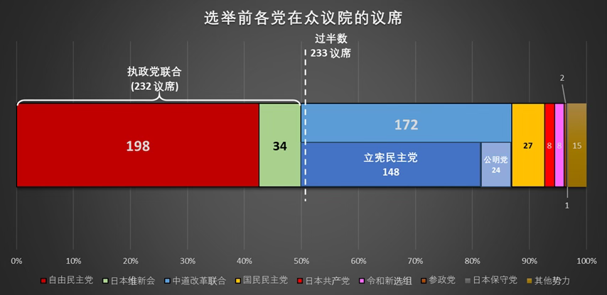 在选举前,作为执政党的自民党与维新会在众议院的合计议席数为465议席中的232,无法安定地运营国会。在本次未进行改选的参议院中,执政阵营同样处于少数执政状态。决定解散众议院的高市首相明确表示,将以执政党阵营实现过半数为目标,若无法达成,将引咎辞职。但是,她并未明确表达本次大选的核心政策议题(尽管在1月19日宣布解散的记者会上,她表示“希望大胆挑战可能引发国论二分的政策与改革”,但并未具体说明究竟是哪些政策会引发国论对立)。