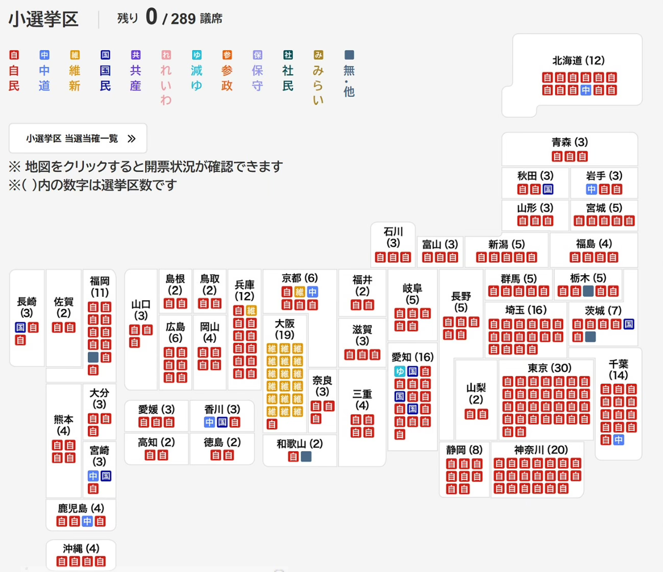观看各个选区,自民党同样达成了压倒性胜利。在全国47个都道府县中,自民党在31个实现了对所有小选举区的全面胜利,其中既包括东京都、神奈川县等人口众多的地区,也包括冲绳县等传统上自民党并不占优势的地区。日本维新会的议席数也小幅增加。