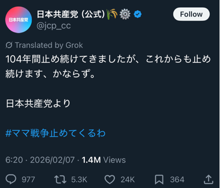 日本共产党也参加了“妈妈要去阻止战争”的标签运动。然而,这使这场运动更加带有左翼色彩(出处:日本共产党的官方X)