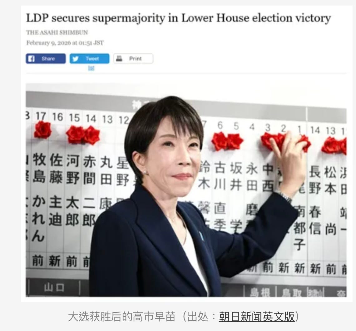 编者按:2026年2月8日举行的日本众议院(下议院)选举,高市早苗首相领导的自民党(LDP)取得历史性压倒性胜利,单独赢得316席(定数465席中的三分之二超多数),创下战后单党最多纪录;加上新执政联盟伙伴日本维新会(36席),执政联盟总计352席,确保议会主导权,党内“一强”格局确立。中文媒体,尤其台湾媒体多从中国威胁视角看待高市早苗的自民党压倒性大胜,认为北京的“战狼外交”、经济胁迫、军事威慑与认知战等强硬施压,反而成为高市的“超级助选员”,激发日本民众觉醒“中国威胁”的现实感,造就此次“高市旋风”和”政治豪赌“的成功。