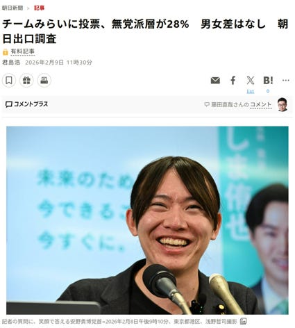首先,就自民党的胜利而言,高市早苗的人气无疑是一个关键因素。她的存在,使自民党得以收复两年前众议院选举以及去年的参议院选举中流失的选票。其中固然包括所谓的保守派选民,但也涵盖了并非必然具有保守倾向的无党派选民和对政治没有关心的选民。根据《朝日新闻》的调查,在比例代表投票中,自民党是最能吸引无党派选民的政党,占比达到23%(位居第二的是未来团队,为14%,而中道改革联合与国民民主党并列,仅为13%)。此外,在《朝日新闻》整理的对高市支持者的采访视频中,有不少受访者表示对“日本首位女性首相”的期待,以及在 TikTok 等平台上频繁看到与高市相关的视频,增强了他们对她的亲近感。