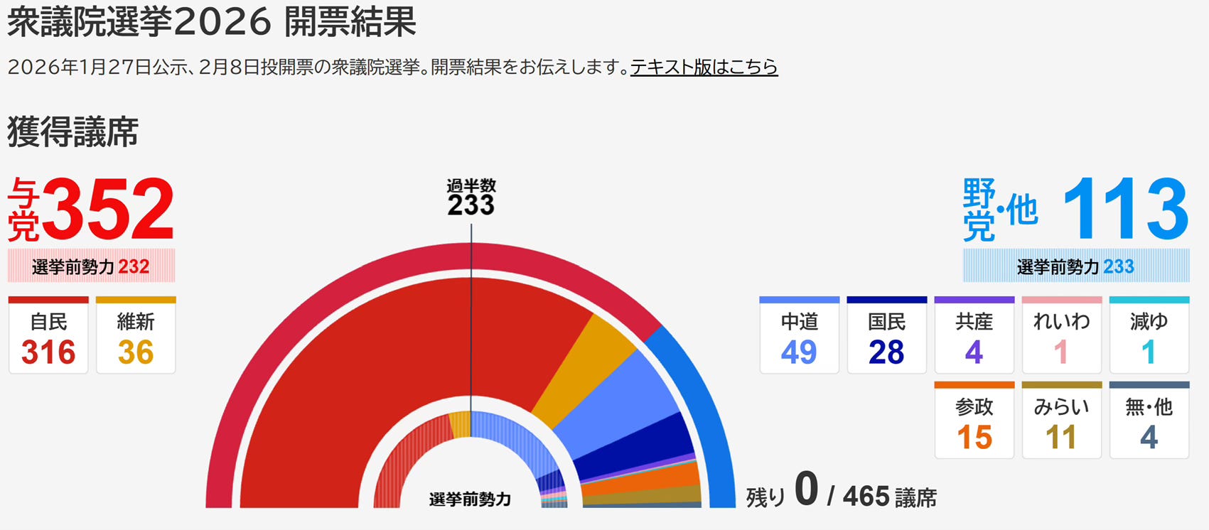 选举结果同样史无前例。由高市早苗领导的自由民主党在465个众议院席位中赢得了316席,创下了该党历史上最大的胜选纪录。加上执政联盟伙伴日本维新会,执政阵营目前共掌控352个席位,约占众议院总席位的75%。