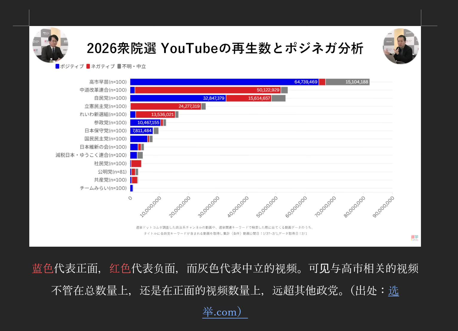 当然,自民党本身也积极展开了以网络为目标的宣传攻势。高市出演的自民党宣传视频,在不到两周的时间内播放量便突破了一亿次,这一数字远远超过了 YOASOBI、米津玄师等日本流行乐界顶级明星所创下的纪录。尽管这一成绩是通过在 YouTube 上反复作为广告投放而实现的,但背后投入了巨额广告费用这一点并不难想象。