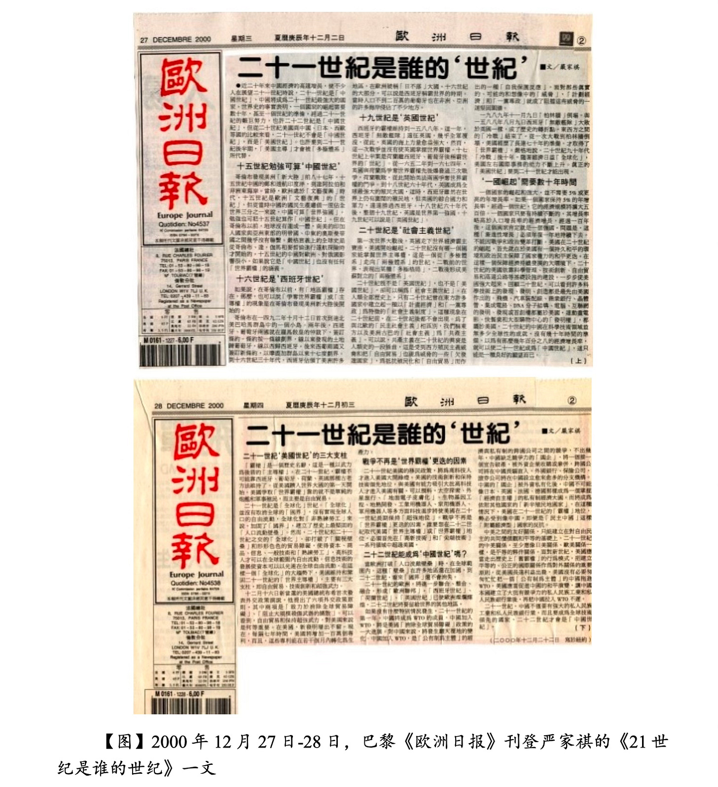 2000 年,巴黎的《欧洲日报》刊载了我写的《21 世纪是谁的“世纪”》。这篇文章,在日本、美国的中文报纸上作了转载。文章开头说:“近二十年来中国经济的高速增长,使不少人在展望 21 世纪时说,21 世纪是‘中国世纪’。