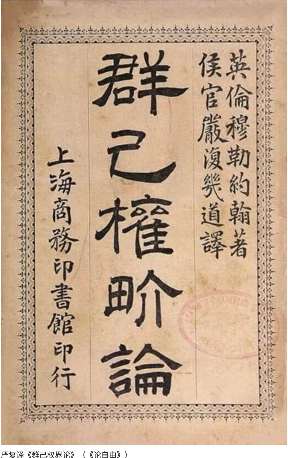 严复翻译穆勒《论自由》(On Liberty)时,为Liberty的翻译绞尽脑汁。如何翻译一个在中文里尚不存在的概念?他的解决方案是创造新词:群己权界——字面意思是”群体(群)与个体(己)之间的权利与边界”。这实在是看似翻译已有作品的原创,中国思想史中,从此出现了那条在众人与一人之间、看不见却决定一切的边界。