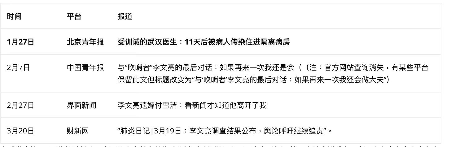 這是武漢封城期間,第一篇被刪除的有關李文亮的報導,但並不是最後一篇。在武漢封城期間,至少有四篇有關李文亮的報導被刪除,兩篇篇為其生前採訪,第三篇為界面新聞採訪其遺孀付雪潔。第四篇為財新記者手記,談論官方公佈的有關李文亮調查結果。