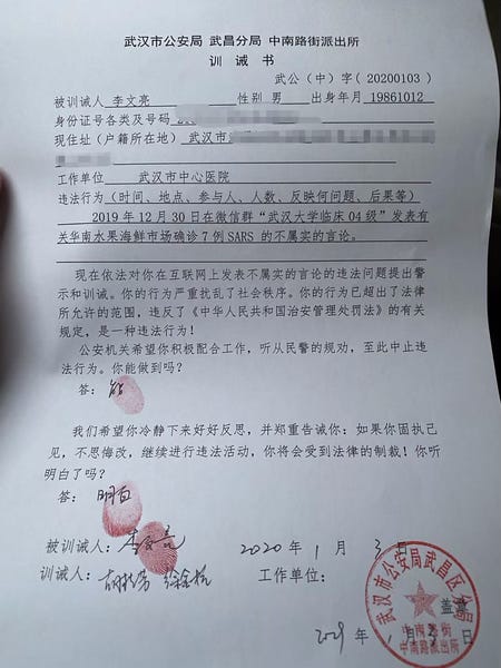 除開宣傳指令、新聞審查和網絡審查之外,對李文亮最為著名的言論審查莫過於對他的訓誡令。