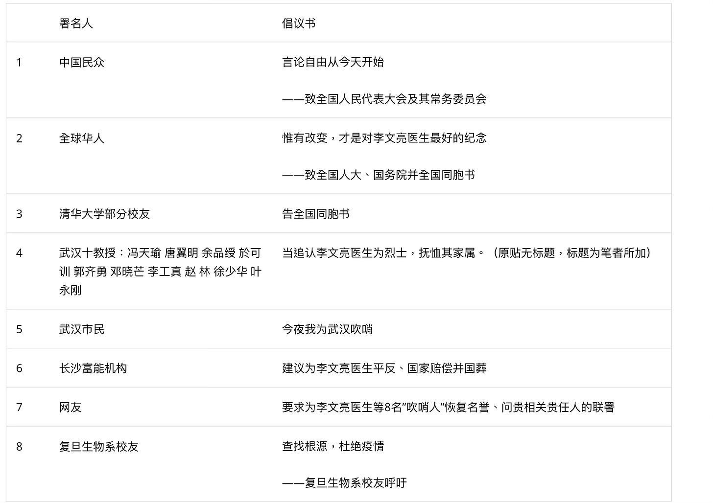 在李文亮去世的那兩天,網絡上還至少流傳了8份倡議書,這些倡議書只能短暫出現在社交網絡上,旋即被刪除得乾乾淨淨: