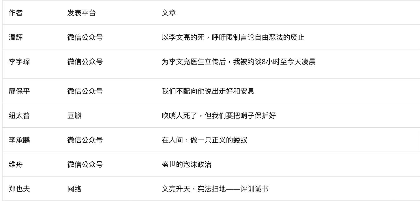 2月7日,武漢疫情“吹哨人”李文亮的去世,立即在中國網絡引起輿論海嘯,在其去世兩天內,網絡上出現大量紀念李文亮的文章,都被迅速刪除,至少有7篇在網絡上被中國民眾熱傳,這七篇文章作者分別是北京大學教授鄭也夫、中國著名作家李承鵬、維舟,著名媒體人廖保平等人。