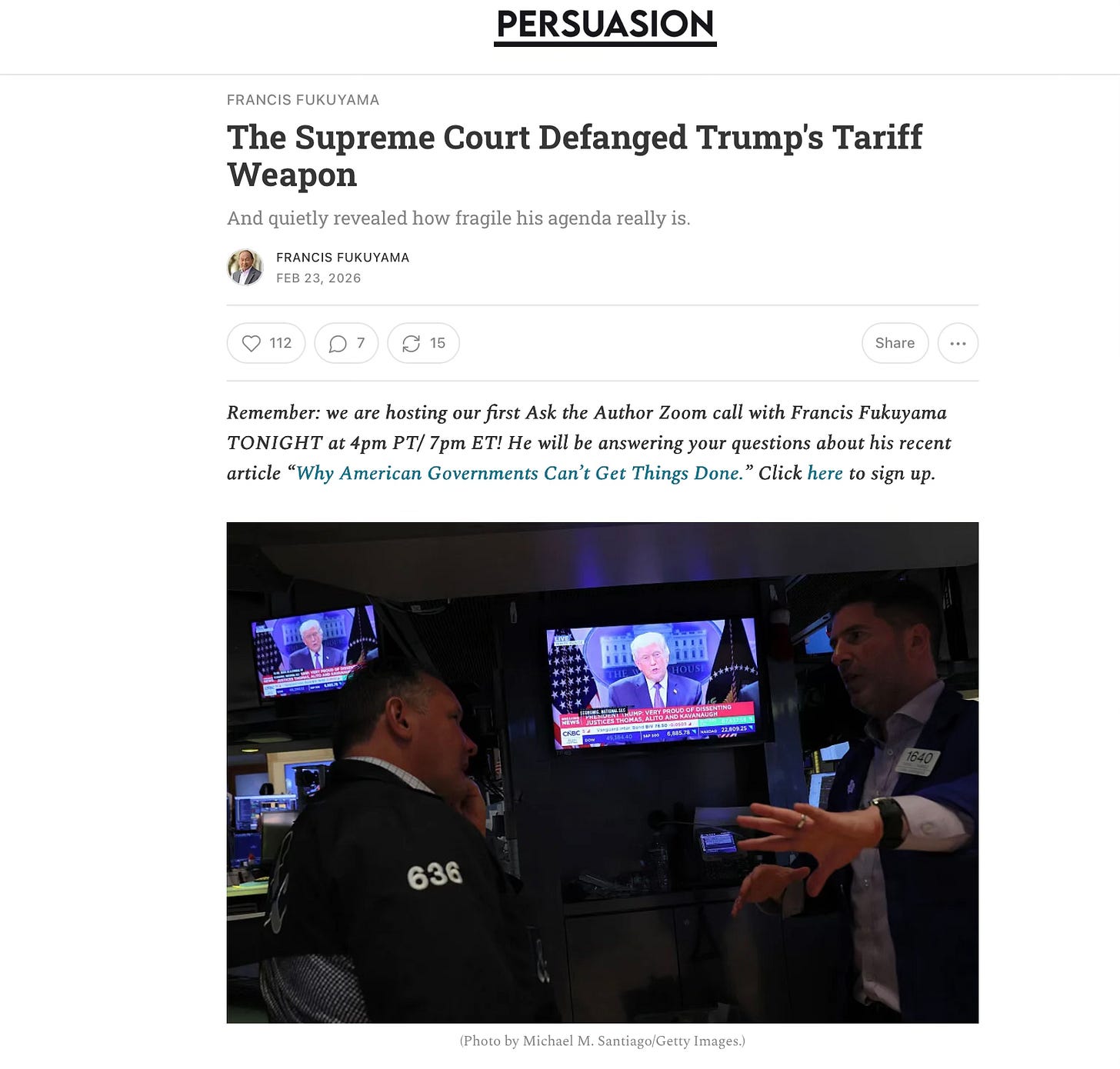而在學者福山看來此次最高法院的判決,不僅讓特朗普失去了他經濟政策的核心基礎,還被剝奪了他特別喜歡用來對付友好國家的那把政治武器。這對美國、也對全世界來說都是一場勝利。本文原文為英文The Supreme Court Defanged Trump’s Tariff Weapon(2月23日)。轉自 “Frankly Fukuyama” 專欄 from American Purpose, at Persuasion.經授權,書評翻譯為中文,為福山專欄最新一期。