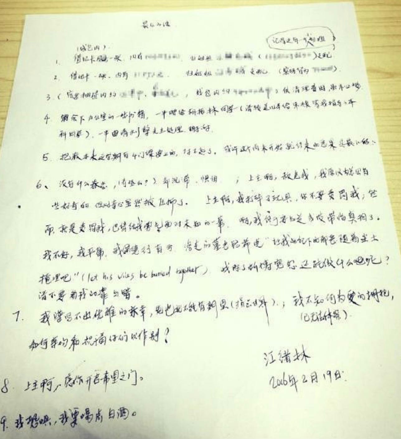 江绪林在遗言中提到“上主啊,我打碎了玩具,你不要责罚我”。从中可见,他也认可第二个论证中的原理。他把自己理解为上帝的“玩具”,而如今要亲手打碎它。这种忤逆神明的举动,难免遭来上主的责罚。如果“我”属于上帝,那这个“我”就没有权利捣毁上帝的“玩具”。但他还是这么做了。我们可以为他的行动找出诸多理由,有直接的,也有间接的,有绝望的,也有逃避的。但是,分析他自杀的理由,做出一副我们这样做仿佛还能挽救一些人的生命的样子来,并不是我的目标。我看到的是,一个对自杀的禁令有着清醒认识的人,却实施了自杀。人自己夺走了神的所有物,这意味着什么?