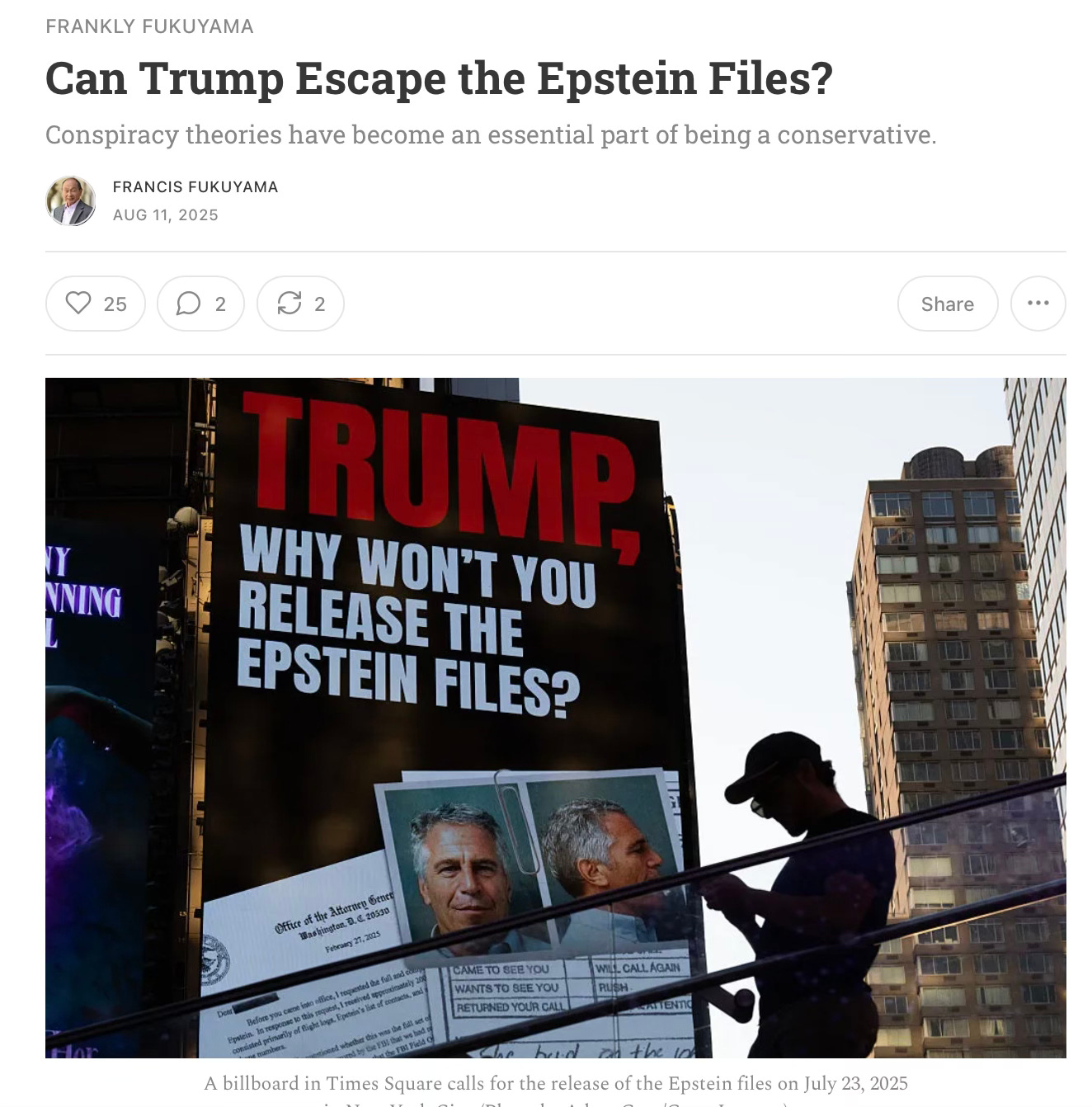 本文原文為英文Can Trump Escape the Epstein Files?(Aug 11,2025),原發来自Persuasion:Francis Fukuyama專欄。作者和雜誌授權,波士頓書評翻譯成中文,為《波士顿书评》福山專欄最新文章。