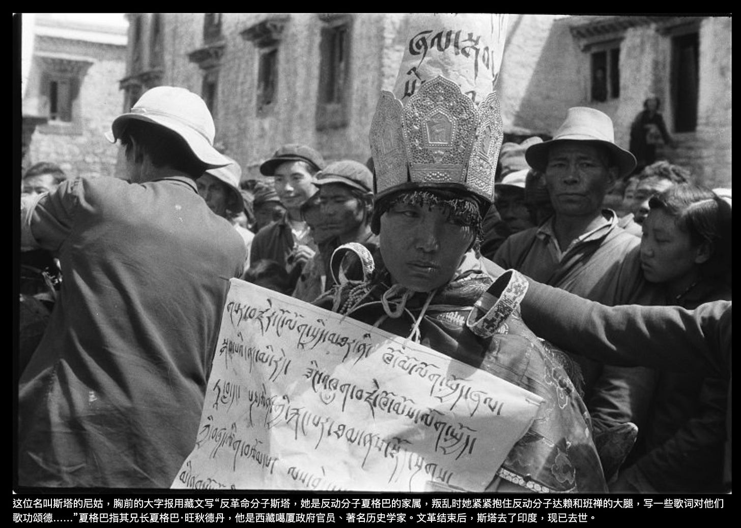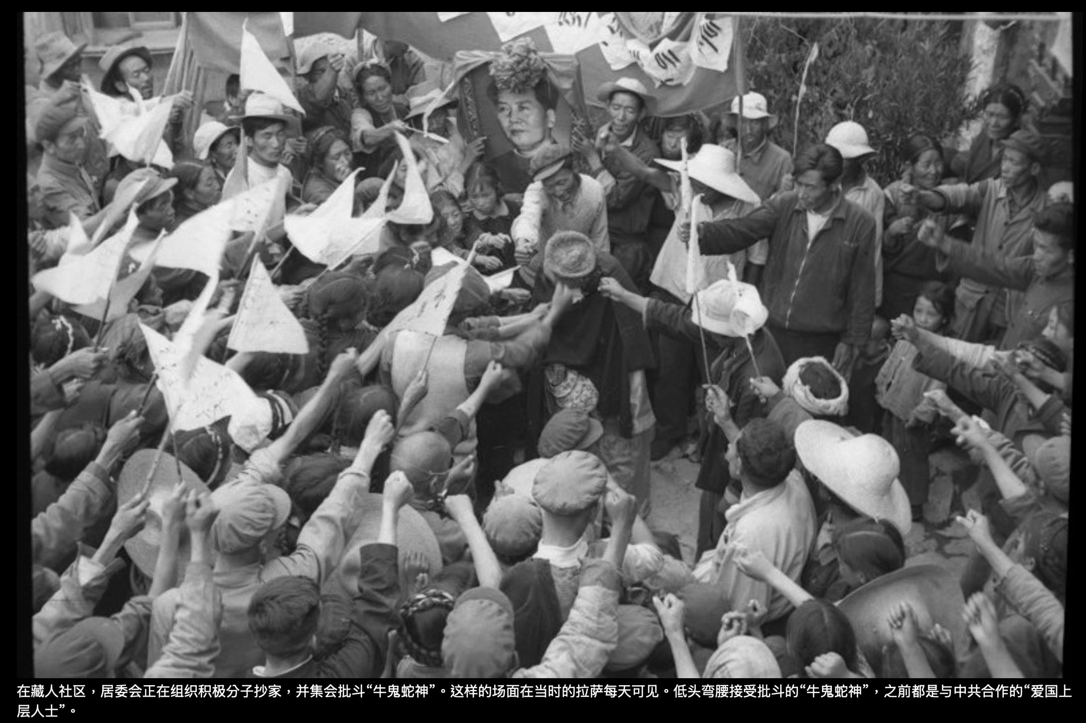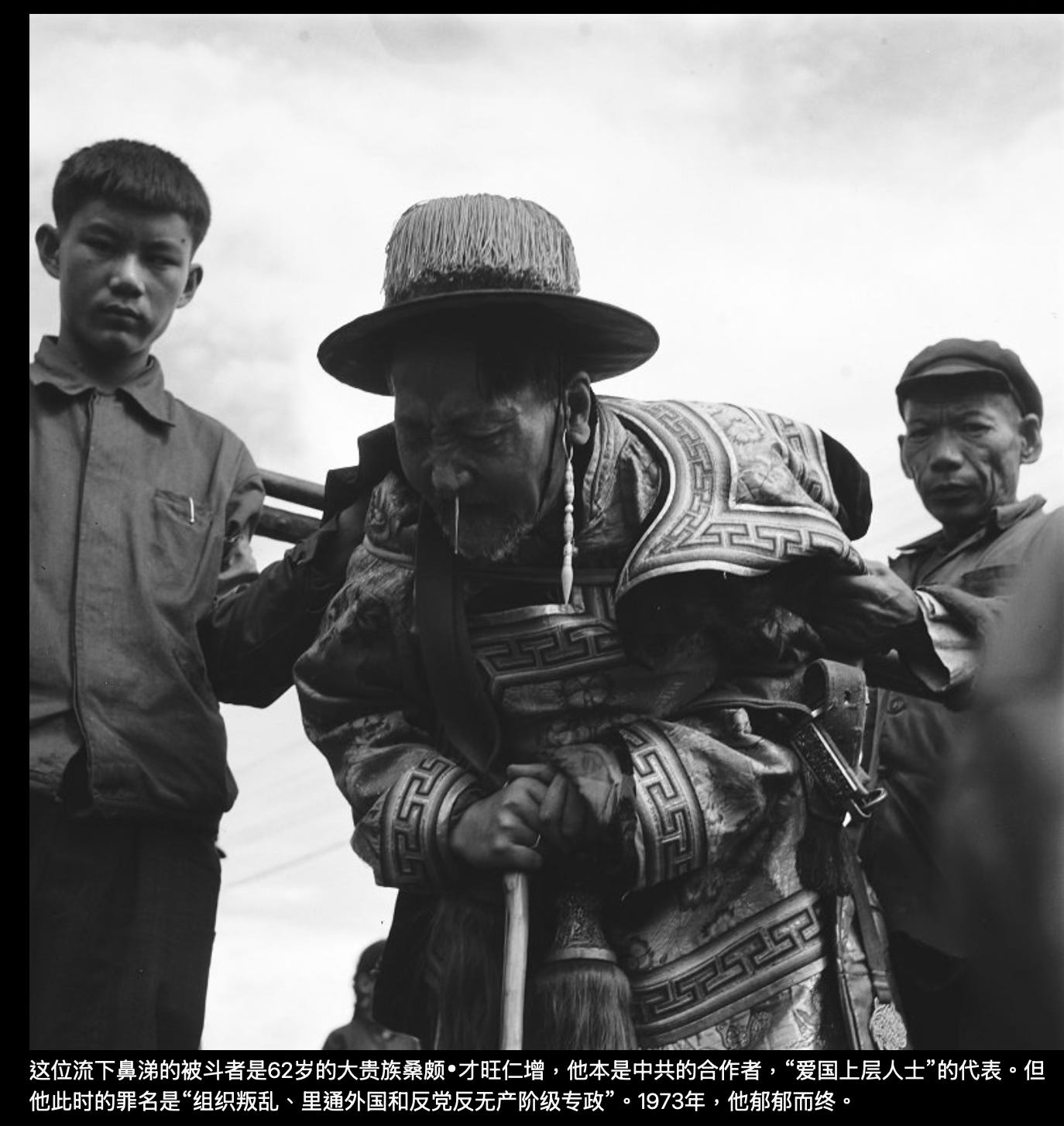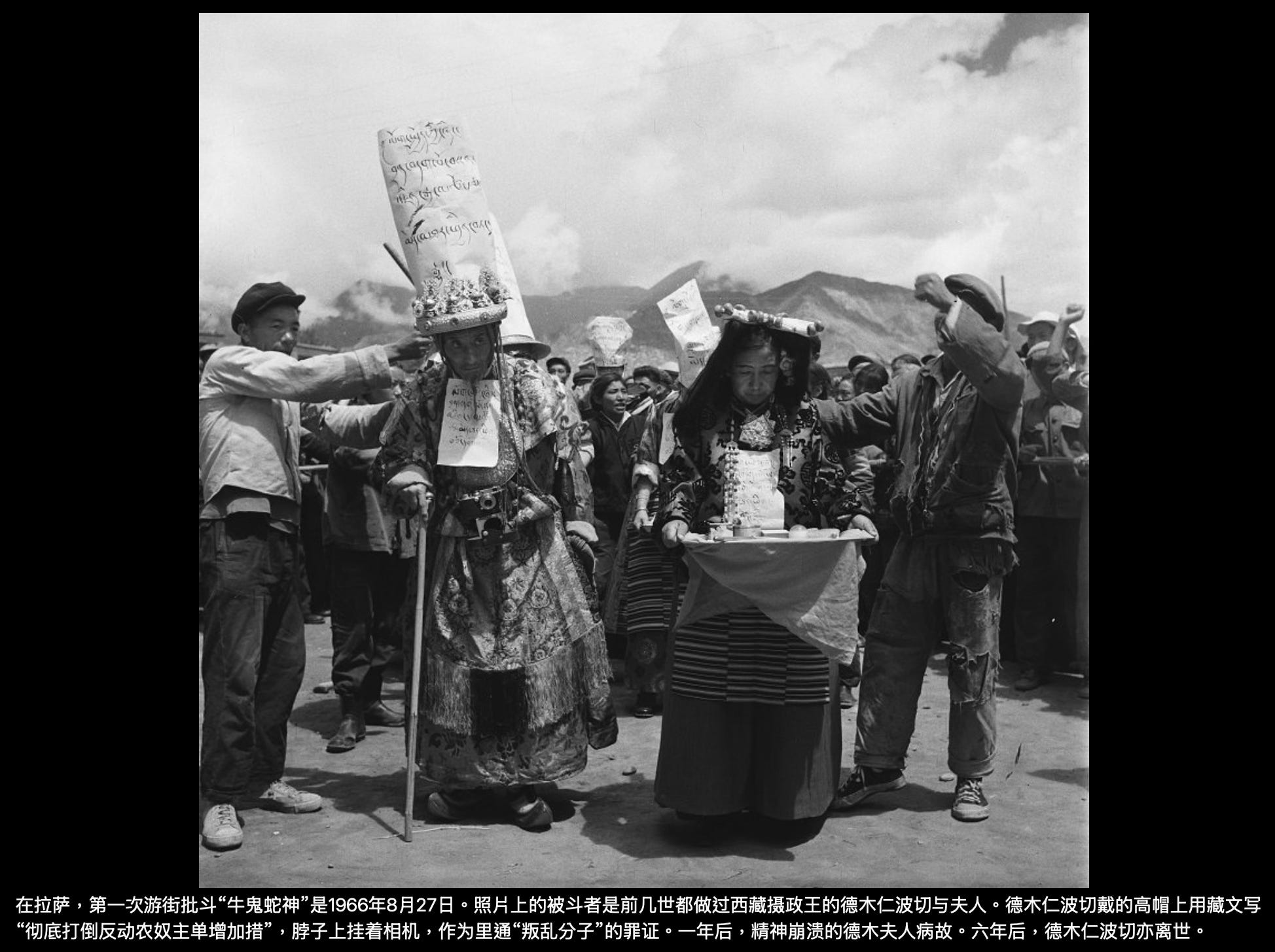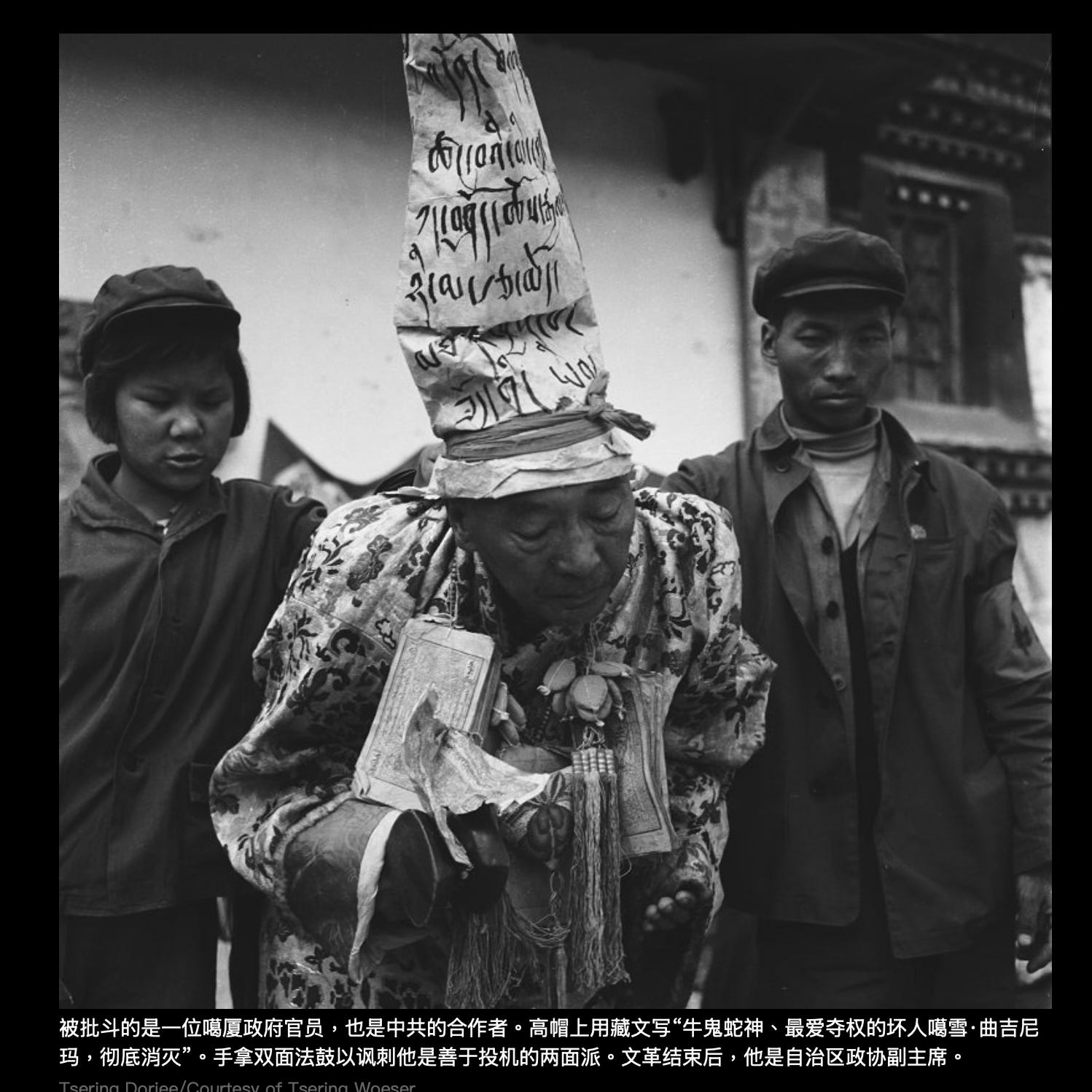 其实很有意思的是,文革中被批斗的这些人,基本上都是中共在1950年代至文革前被当作“统战对象”的上层人士,更因为他们在1959年的所谓“叛乱”中并未跟随“达赖分裂集团”“叛逃祖国”或“弃暗投明”而被中共优待。也即是说,他们都是中共的合作者(有一位高阶喇嘛还是西藏军区的线人),却在文革中被当作“牛鬼蛇神”打倒在地,其结果是疯的疯,病的病,死的死——照片上的部分人死于文革时期,部分人死于文革后,迄今幸存无几。而在幸存者当中,有的人离开西藏去了国外。留在西藏的,重又成为可以享受高官厚禄的“统战对象”,分布在政协、人大和佛协,充当中共需要的政治花瓶。