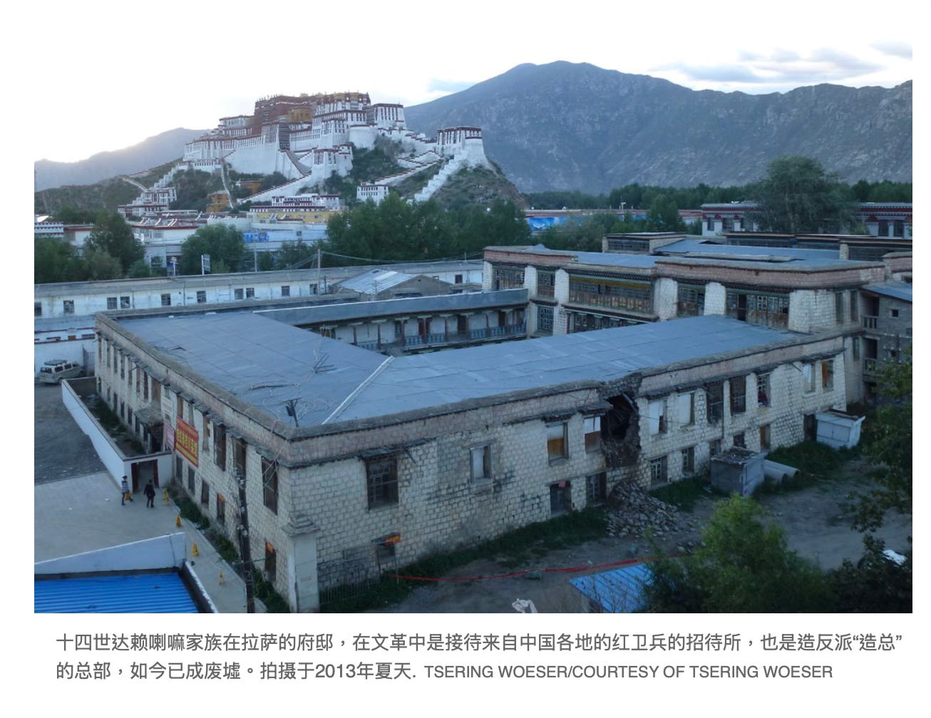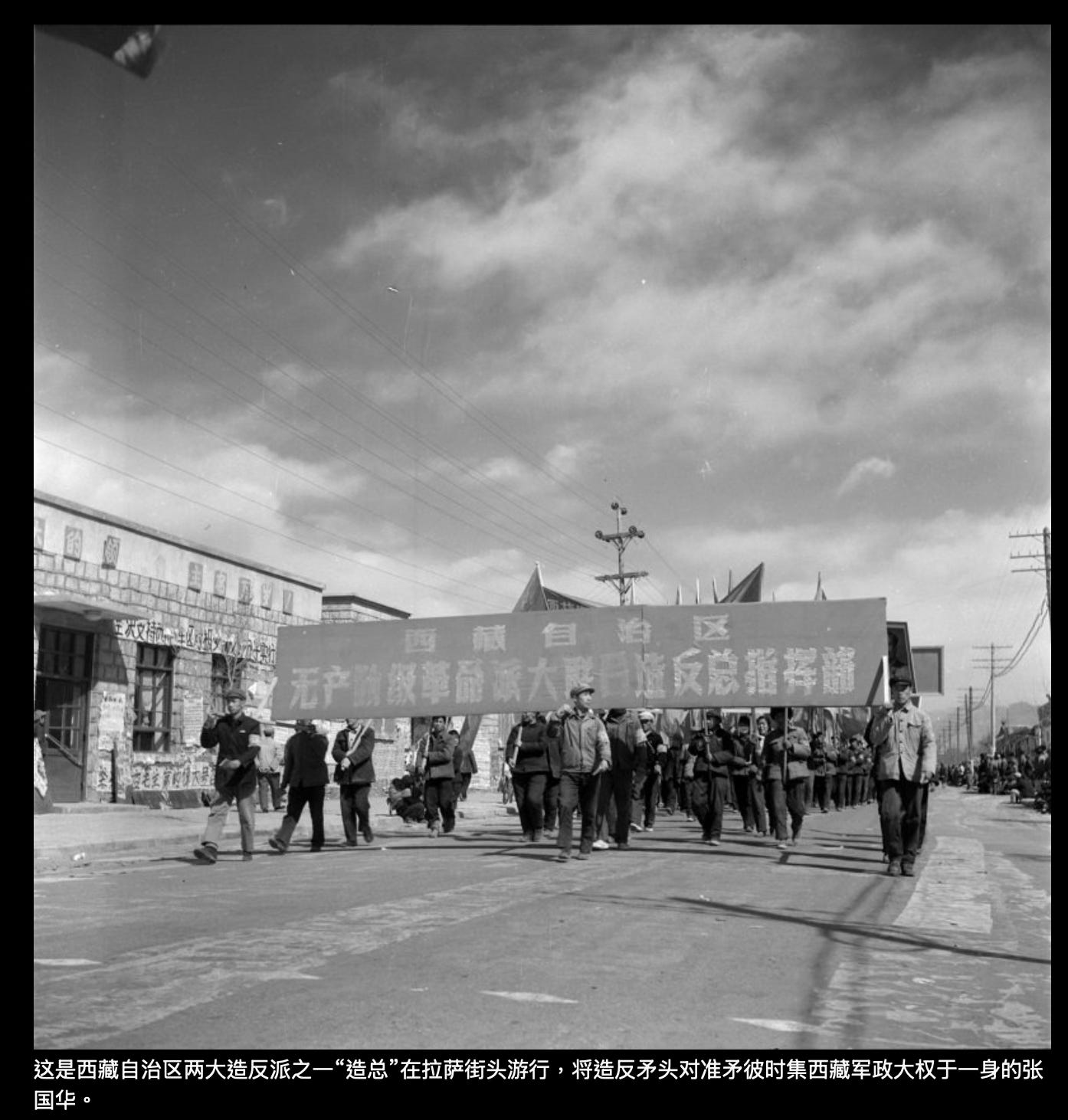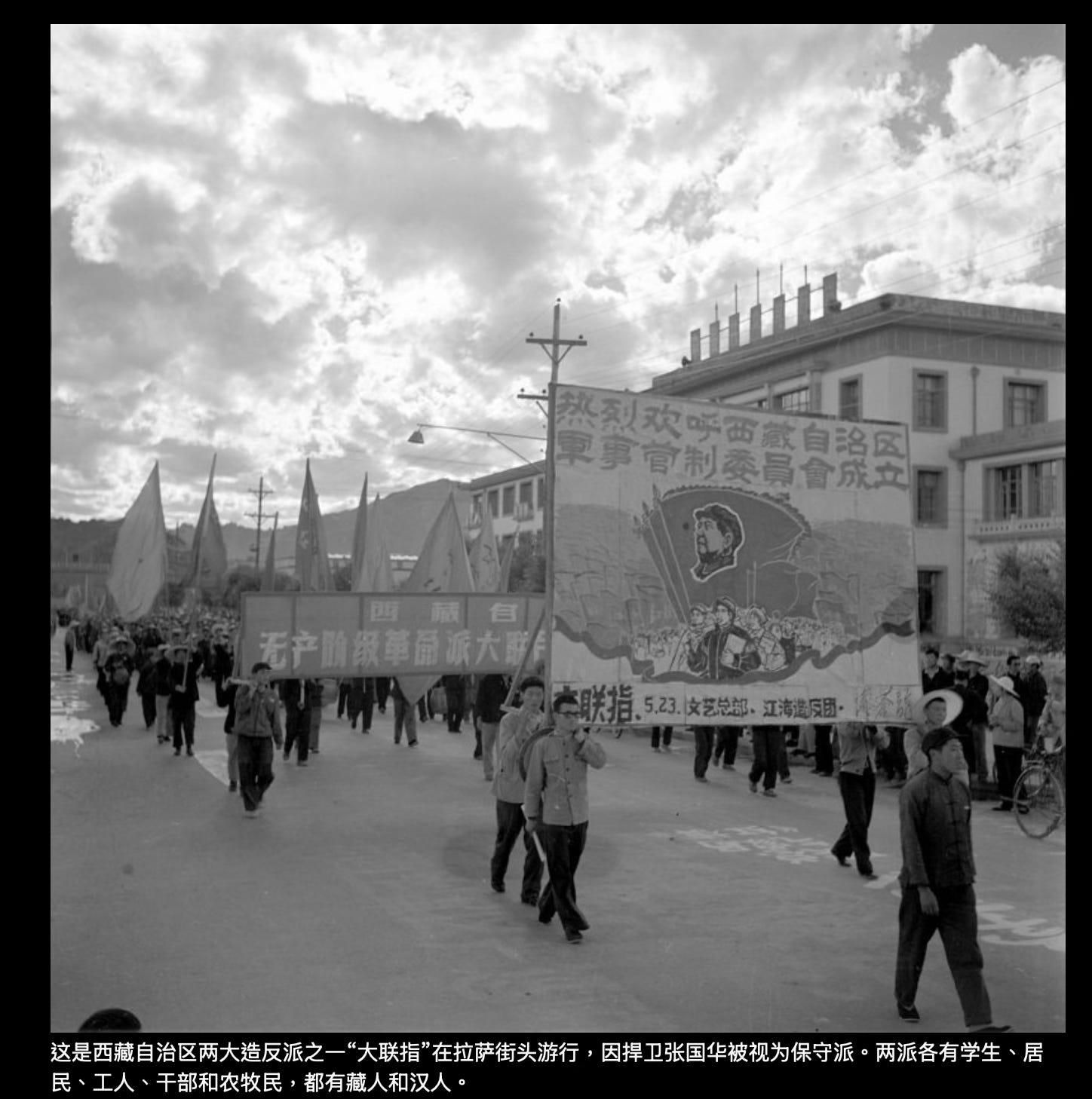 答:2001年,我采访过他两次。当时我是西藏文联《西藏文学》的编辑。我听人说起他,就找到他的电话联系了他。很意外,他对我很热情,很愿意接受采访,第一次见面就侃侃而谈几个小时,还请我吃饭。但我知道他的背景,就没有给他看我父亲拍的这些照片,担心他看了照片不会对我讲。实际上有一张照片上有他。他正带着红卫兵,在达赖喇嘛的夏宫罗布林卡前往大门挂牌,牌子上写着“人民公园”。当时他问我为什么采访他。我说我想写关于西藏文革的小说。他说写小说没意思,建议我写纪实的。我后来明白他为什么愿意接受我的采访,是因为他想通过我为“造总”说话。