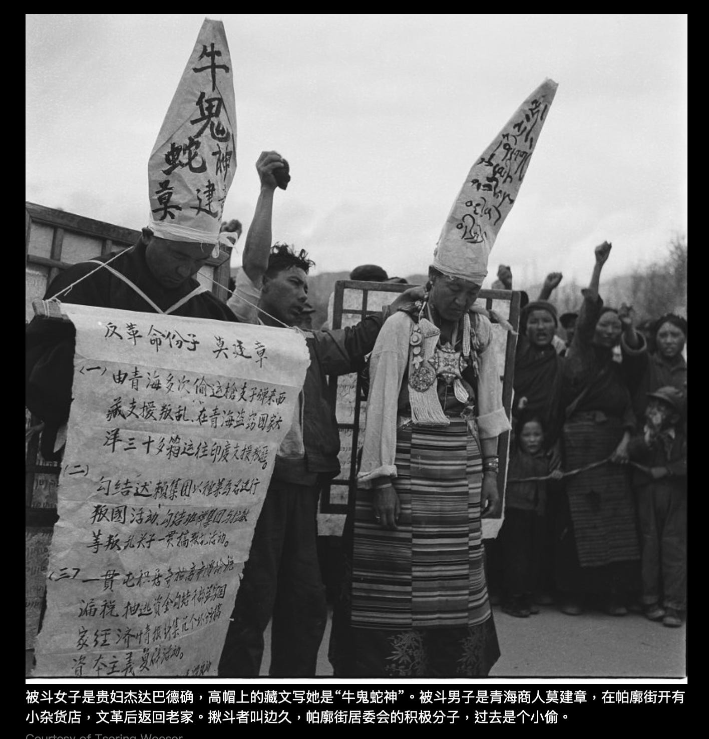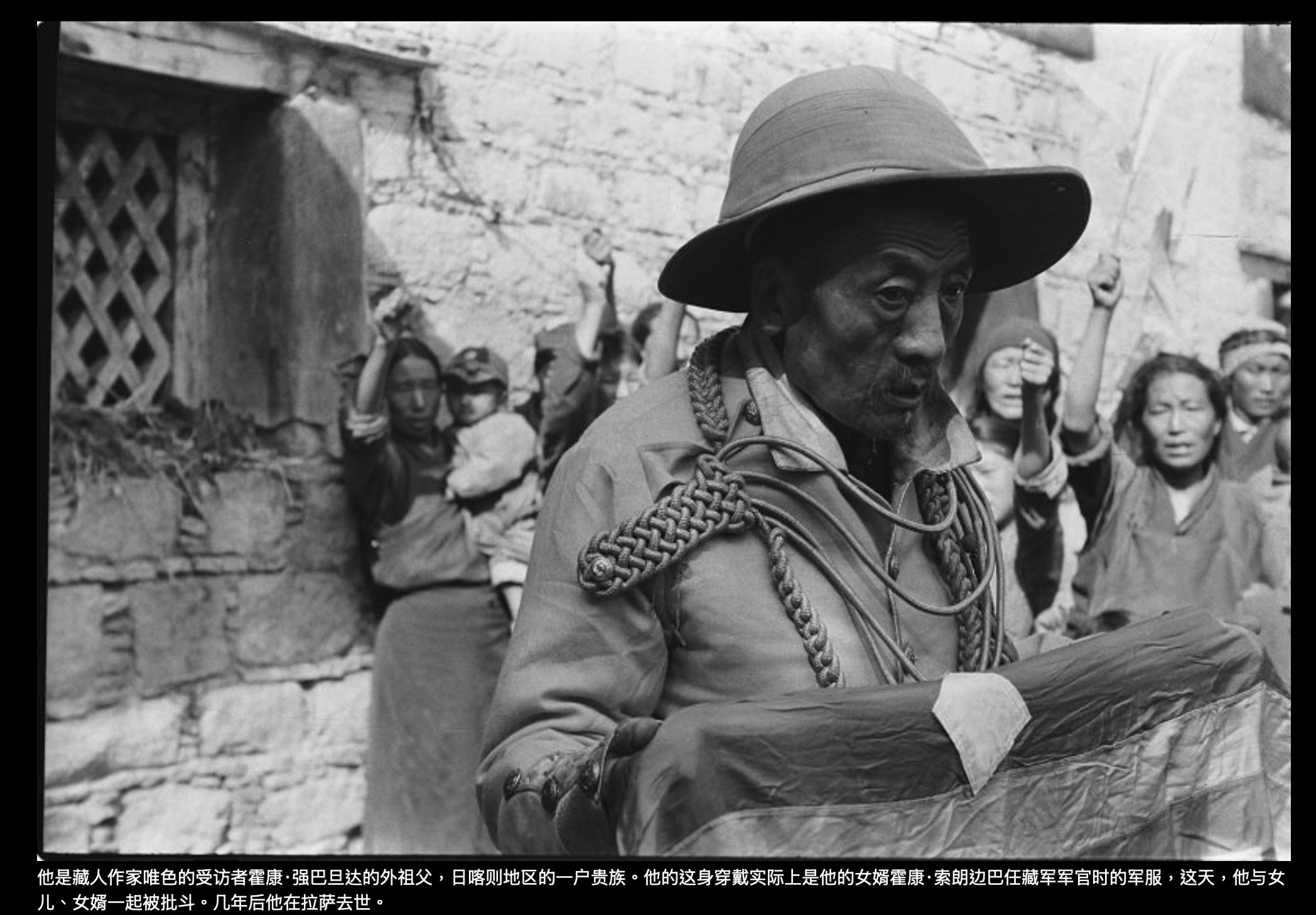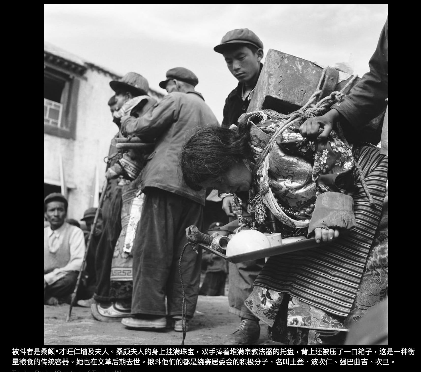 还有一位被批斗的贵族霍康·索朗边巴的儿子,文革时他不在拉萨,只听说父母被斗,但不知是怎样情景。他问过父母,父母也不怎么告诉他。当我给他看照片时,他第一次看到父母及外祖父被批斗,他的反应令我震惊。当时他快60岁,他翻来覆去看照片,突然爆发出剧烈的哭泣,但却是特别压抑的恸哭,全身发抖,泪流不止,却没有声音。他也给我讲了很多故事。