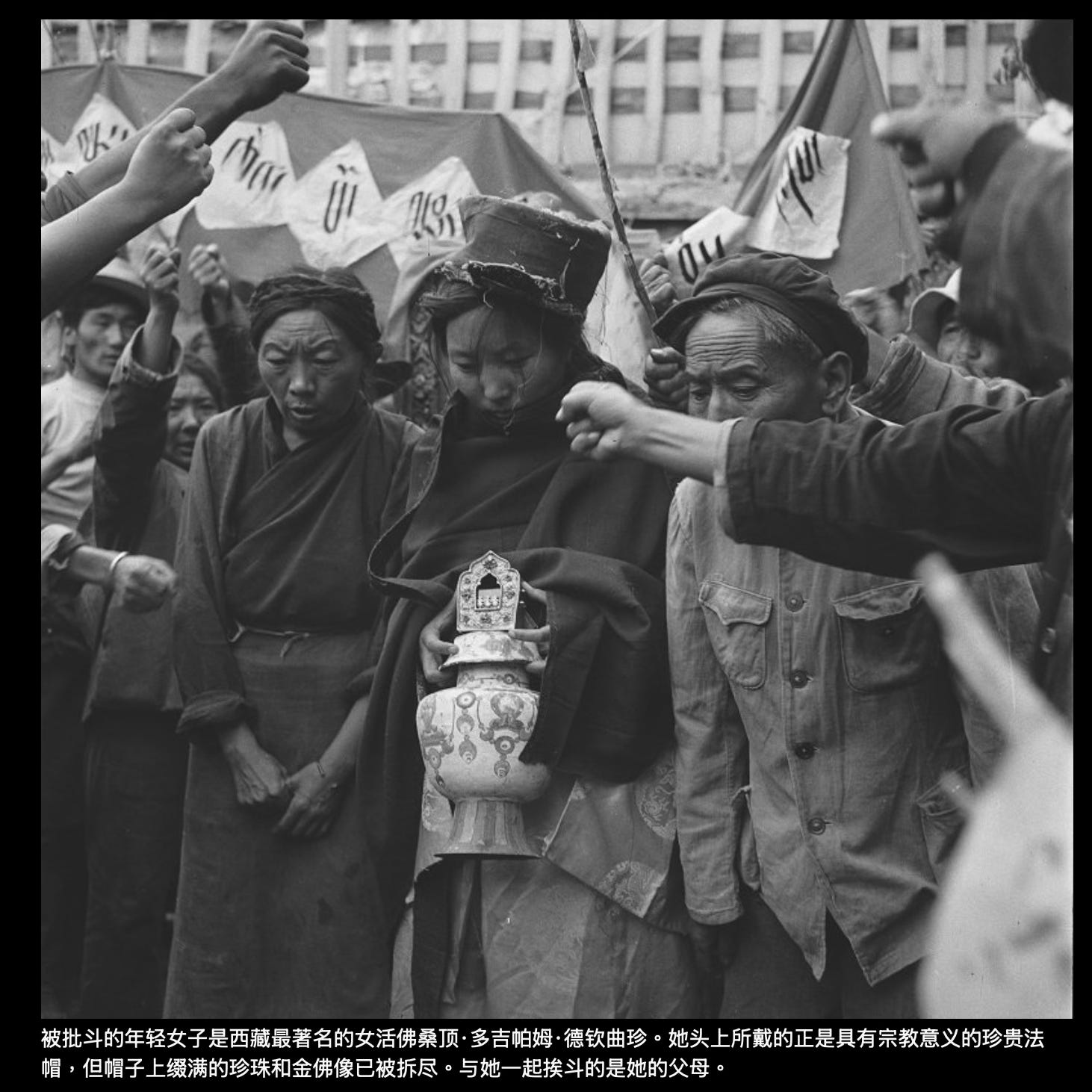 照片上,被批斗的多吉帕姆戴着一顶黑冠。在西藏,只有两顶黑色法冠,一顶是噶玛噶举法王噶玛巴的黑冠,一顶就是女活佛多吉帕姆的黑冠,密宗教义认为是十方空行母以自己的头发编织而成的黑色金刚宝冠,具有不可思议的加持力。这顶缀满金像、金丝和珍珠的法冠,本身也价值连城。但在批斗中,法冠上的金像金丝和珍珠已被拆走,后来据说这顶黑冠也被革命群众扔进火里烧了。