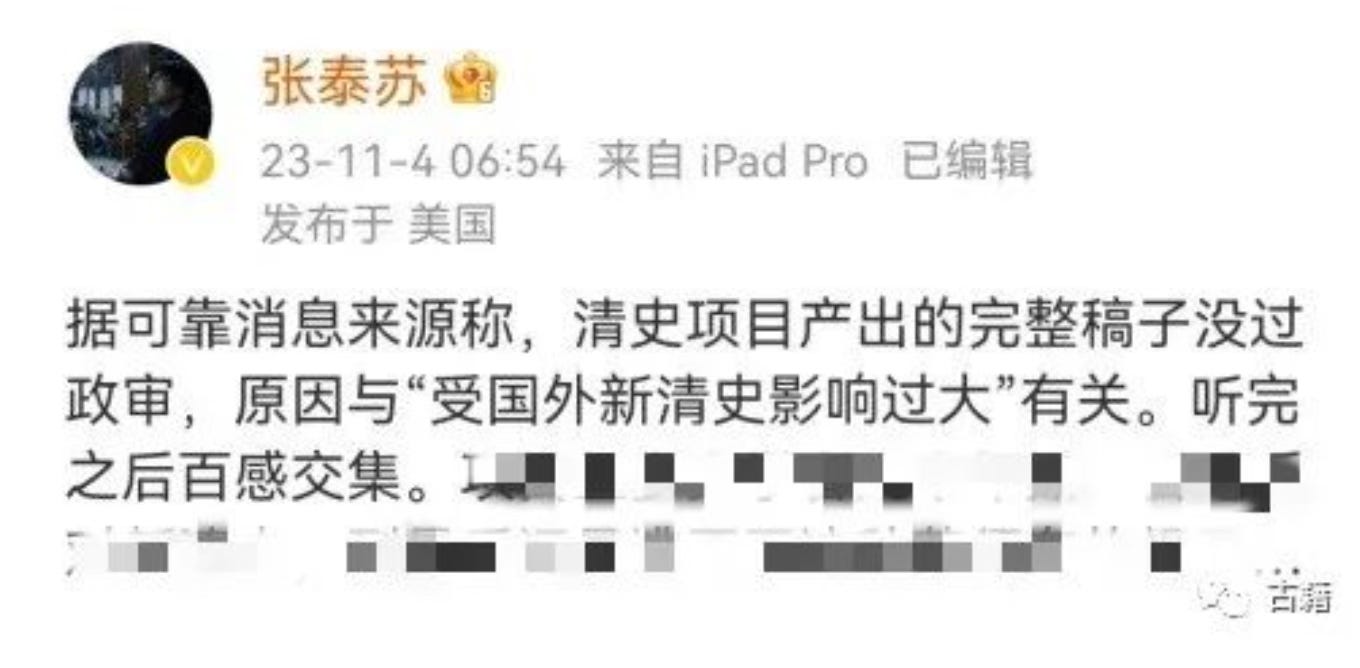 2023年11月,據耶魯大學法學院教授張泰蘇在個人社交媒體透露,儘管項目中眾多學者長期反對新清史,該項目稿件因「受國外新清史影響過大」未通過政審。