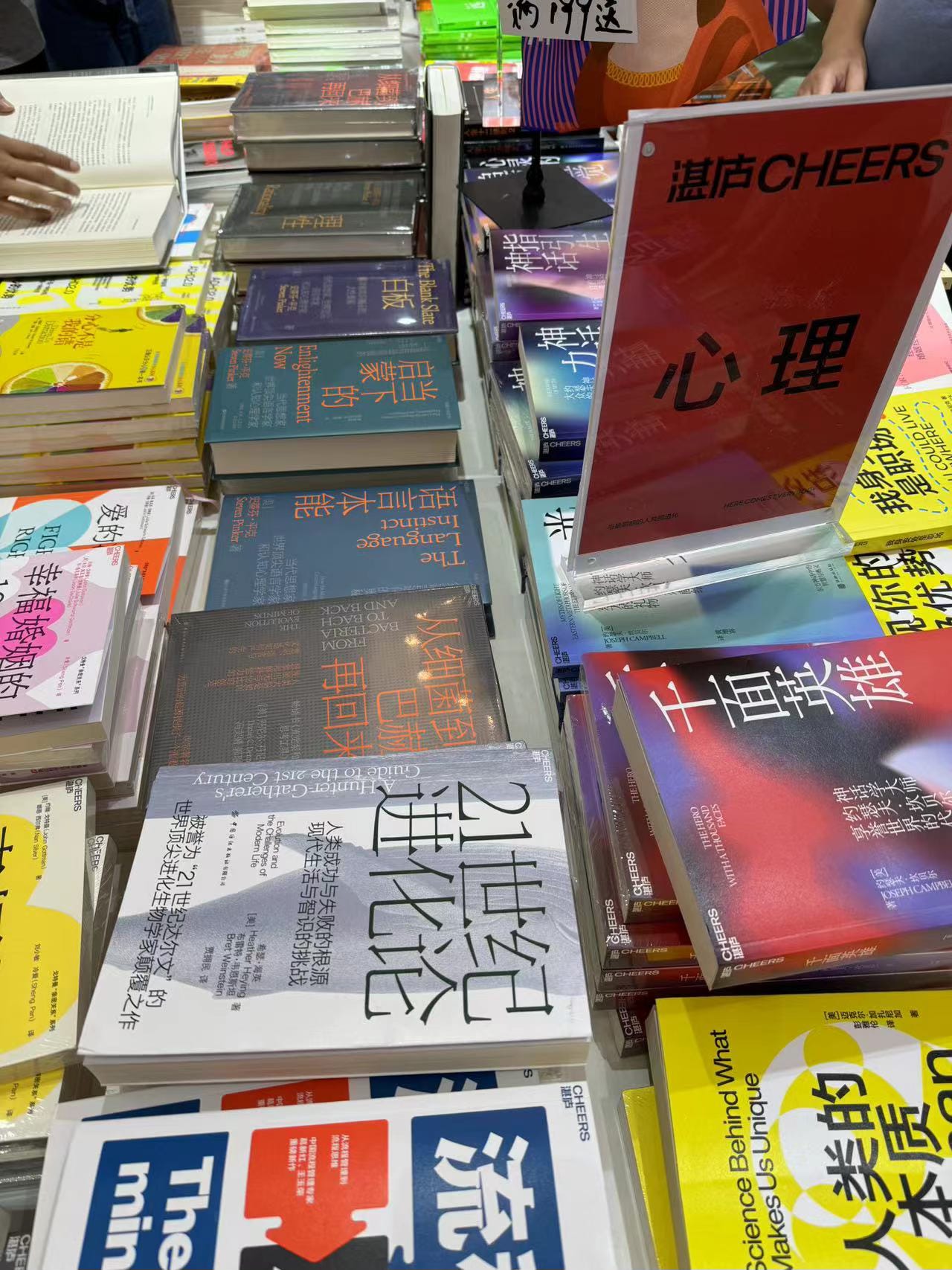 在某出版社展位上,我看到有些译作。这些年在播客上,能经常听到原作者的名字,如Sam Harris, Jordan Peterson, Steven Pinker, Paul Bloom, 等。译作相对于中文国产原著,要贵很多。尽管如此,价格也只相当于国外英文原著的三分之一。考虑到还能打五折,哪怕封面设计有些丑陋,买到手也很划算了。