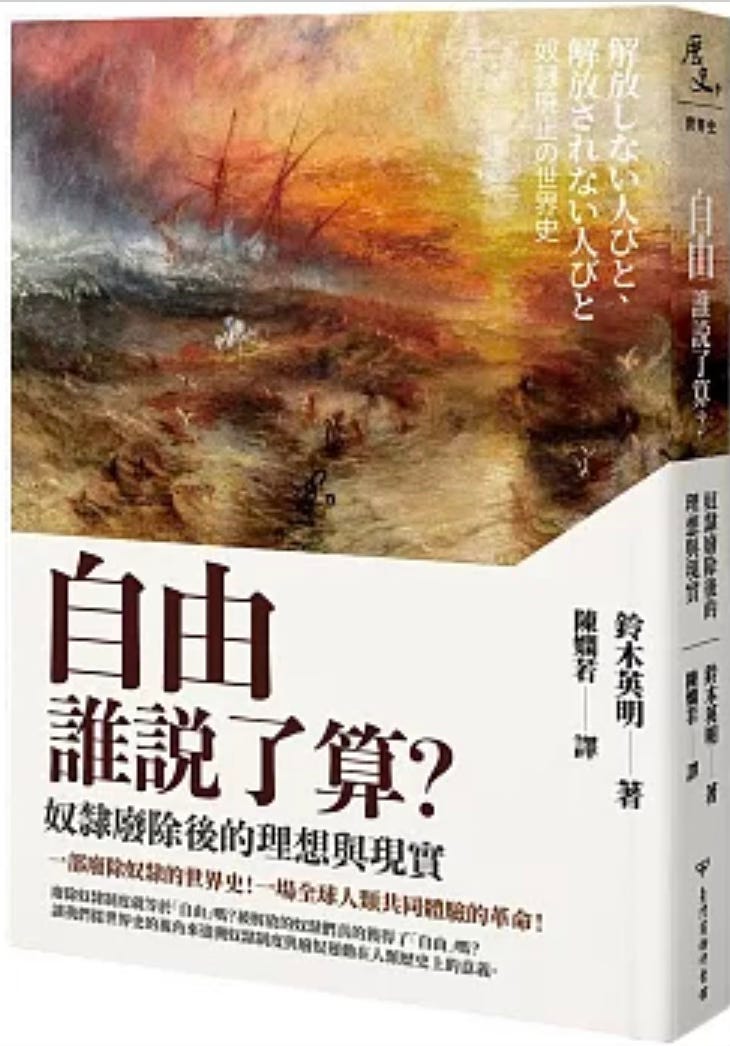鈴木英明教授的研究專長是印度洋地區的奴隸制,在臺灣商務印書館出版的「歷史的轉換期」叢書中《1789年:追求自由的時代》一書中他負責撰寫〈印度洋西海域與大西洋奴隸制度∕奴隸交易的廢除〉一章。他長期鑽研這個主題,是撰寫這個主題的不二人選。我上述的例子大多集中於對於大西洋世界的奴隸貿易與奴隸社會的研究,但是鈴木教授在這本書中突破了這個以歐美為中心的視野,讓我們看到一個全球性的、跨國的奴役體制與廢奴運動。他高明地強調跨國性與共時性,描繪的不再是一個單一的奴隸與廢奴運動,而是一個在全球的範圍內,多元同時並行的複雜運動。讓我們得以真正反思廢除奴隸制度對我們所處的現代社會的意義。
