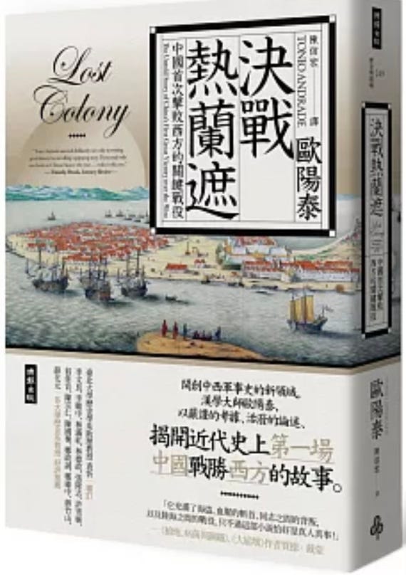 我在那本書中指出,荷蘭之所以能夠殖民台灣,不是因為科技或經濟組織方面的優越,而是因為中國、日本與朝鮮國的政府都無意經營台灣。我寫道,隨著國姓爺在一六五○年代崛起,這種現象也就改變了。國姓爺追求的目標是攻下北京,滅清復明;但他發現自己達不到這項目標之後,便決定轉而進軍台灣。在講述他征服台灣的一個簡短章節裡,我提到他打敗荷蘭人根本不費吹灰之力。我認為他的兵力極為強大,荷蘭人絕對不可能戰勝他。因此,我強烈支持歷史修正主義模型,也認為歐洲的擴張,背後最重要的因素不是科技能力,而是政治意志。